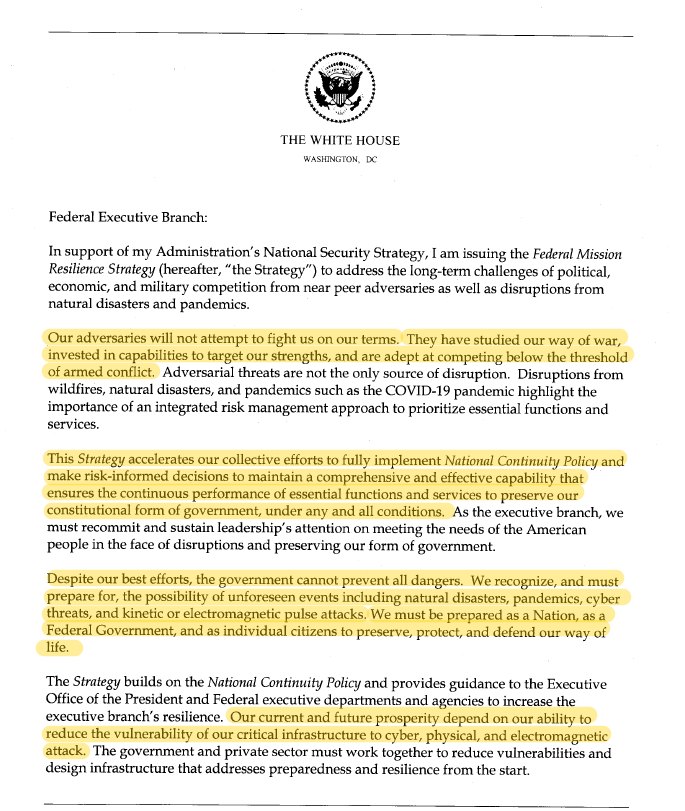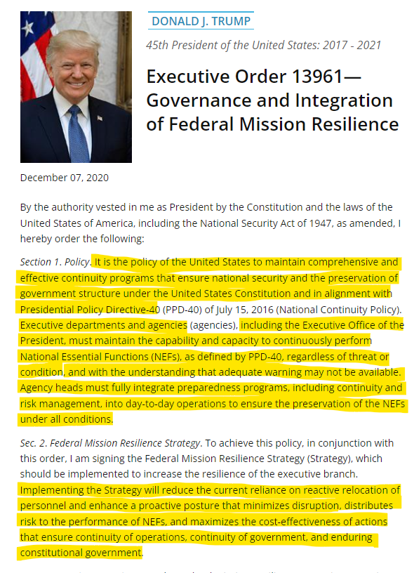 13961 implemented Operation Federal Mission Resilience (download). See also page that shows both documents. This is a strategy that focuses on what can be done to provide a continuity of government if our country is threatened or incapacitated. See the following screenshots of both of these documents.