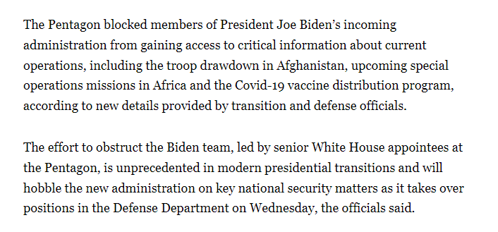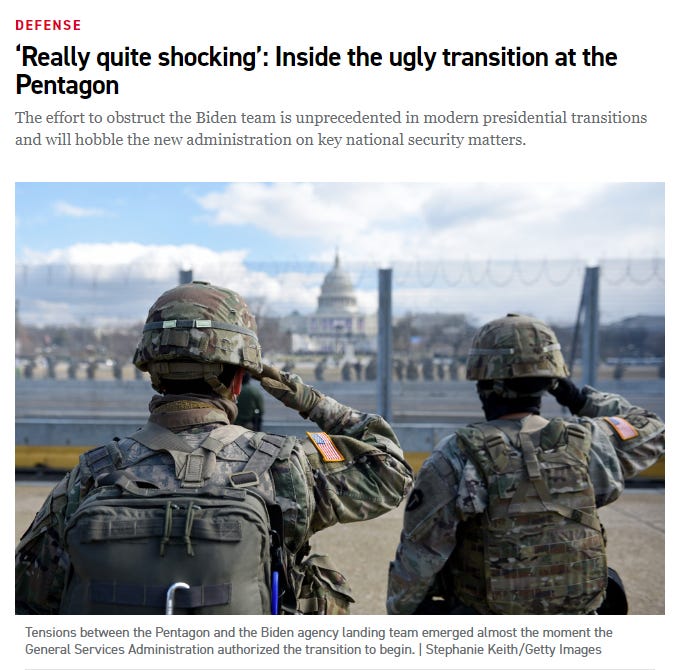 I’ll state the obvious. It seems they were never given this vital information on national security. The following article from Politico entitled ‘Really quite shocking’: Inside the ugly transition at the Pentagon” outlines the following: