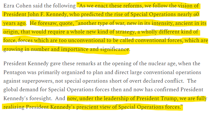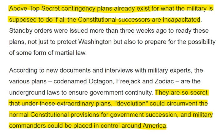 In December of 2020 Chris Miller who was then the Acting Secretary of Defense as well as Ezra Cohen who was the Acting Secretary for Intelligence and Security issued changes to the Special Operations Force. Keep in mind, this was December 2020. Trump was about to leave the White House. In this meeting, Chris Miller announced that Special Operations would report directly to him. Also, Ezra Cohen announced that the Special Operations would be on par with the Military. I find this fascinating. Couple this with devolution and what you now have been told of the continuity of government plans.