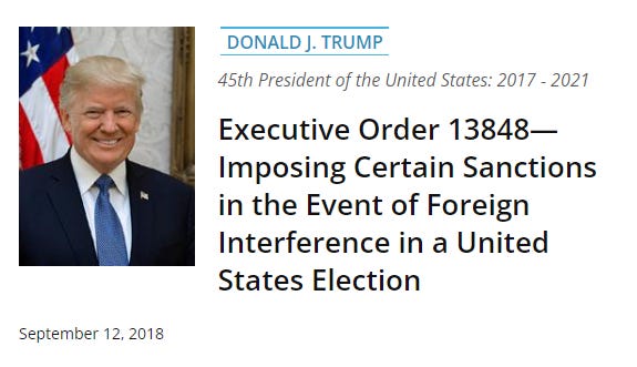 Additionally, I think it quite interesting that Executive Order 13848 was put in place by Trump in 2018 which imposes certain sanctions in the event of election interference. One of the election fraud claims indicates that there was election information going to foreign countries. See the following link to look at the order.